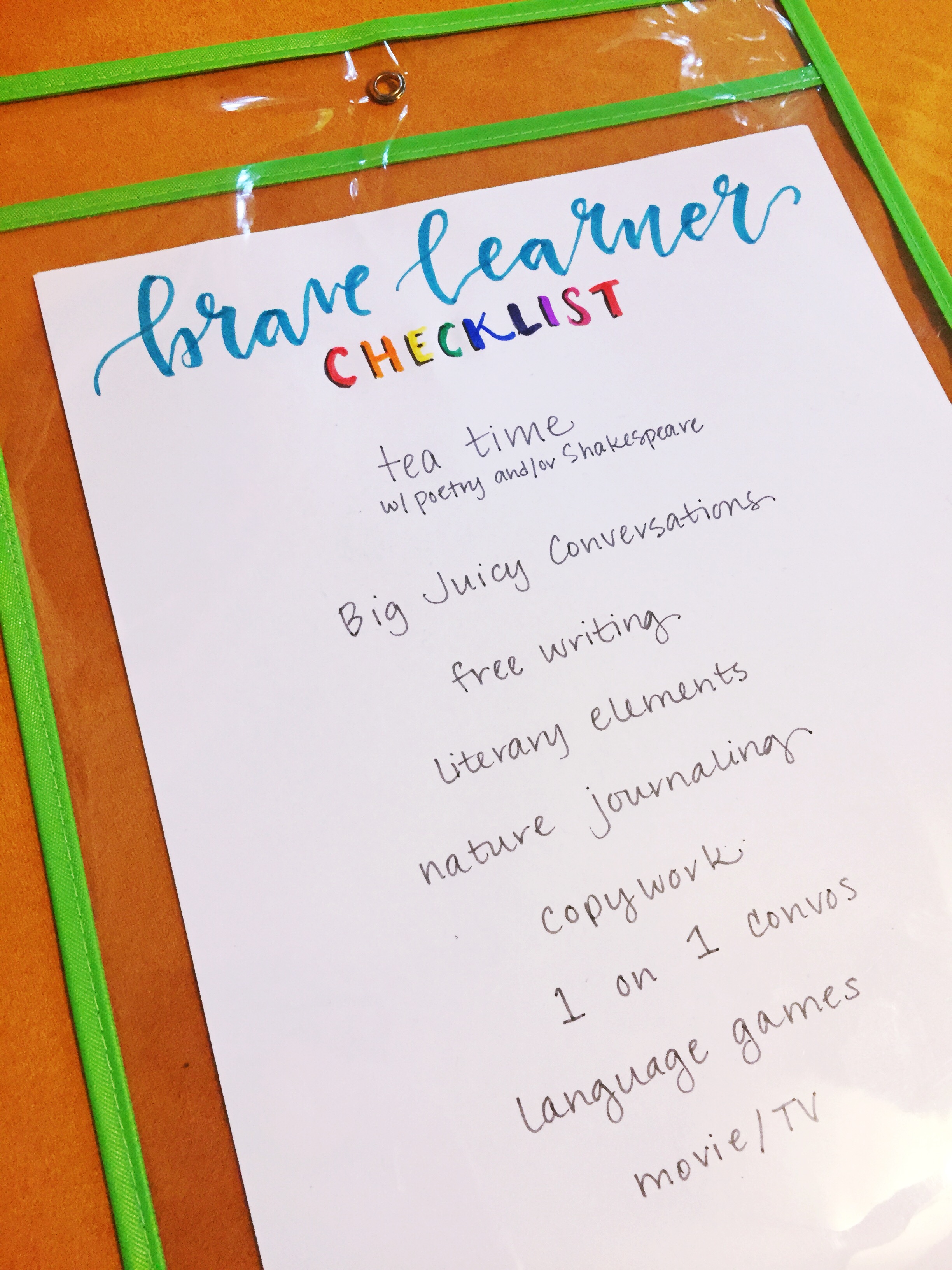 The way our LA rhythm works is: read aloud/journal/play (Blossom & Root), read aloud/narration/play (B&R), word game/reading word list/mini poem (B&R), copywork/a lesson from The Good and the Beautiful/free write. So, yesterday, was a read aloud/narration/play day, so I know today is going to be a word game/reading list/mini poem day. So I go to the relevant places: the next section of the book, the next list, the next poem worksheet. We do them. We write those pages, lists, etc. down in the planner.