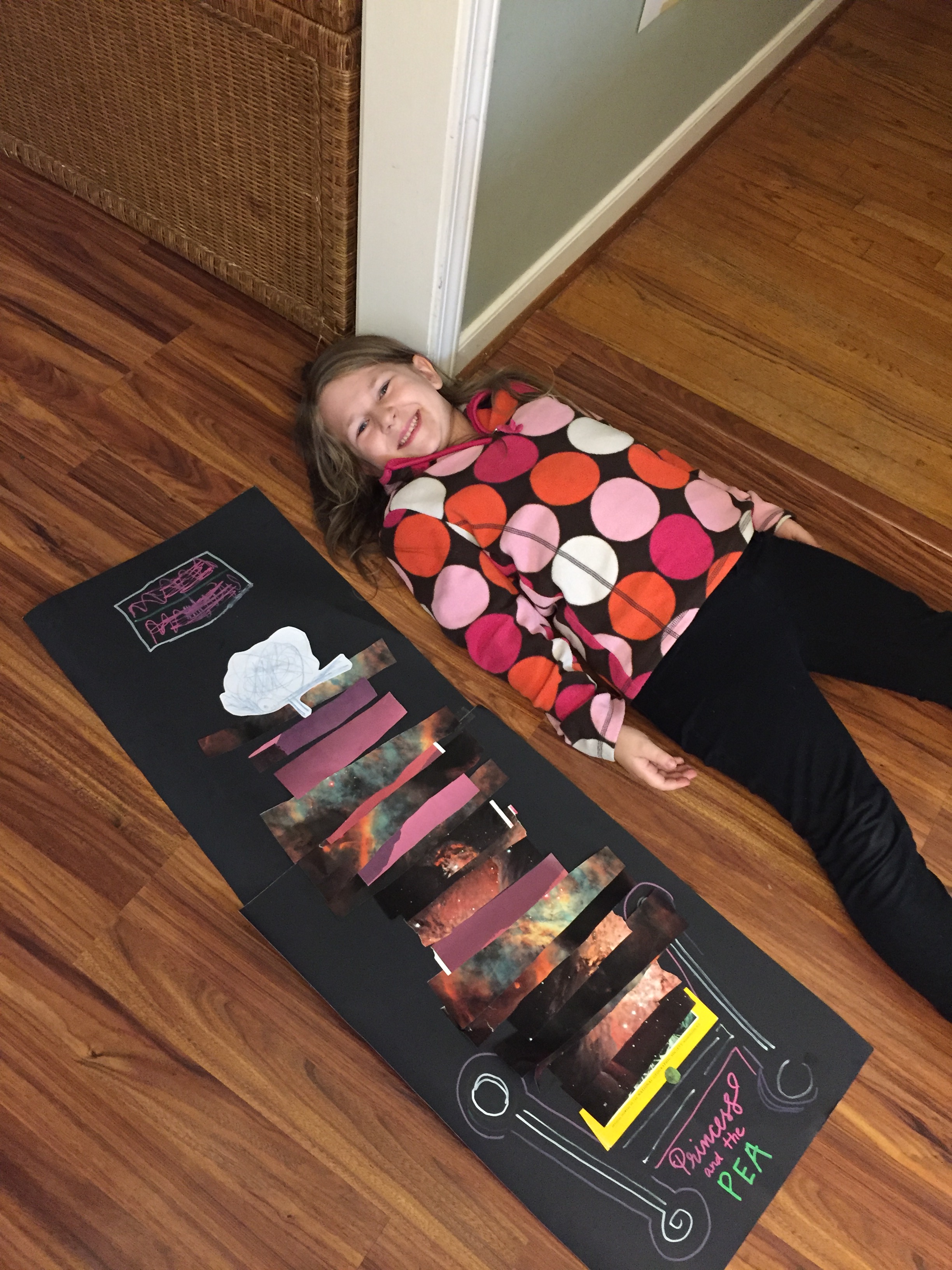 She drew the princess with “super crazy hair” because she was tossing and turning all night, “and everyone knows that you get crazy hair when that happens.” In the end, she made a little video explaining her art and narrating the story to me using her piece.