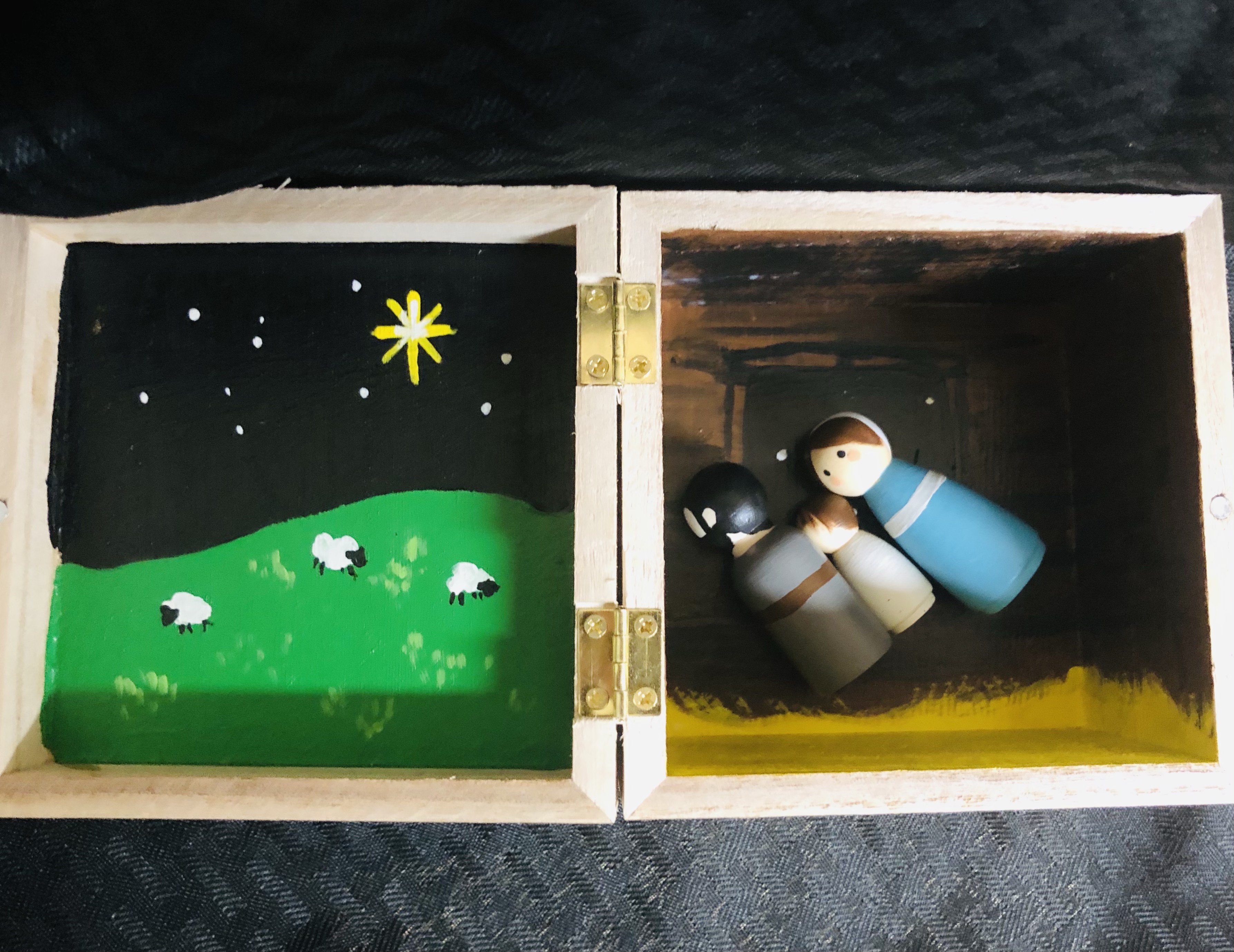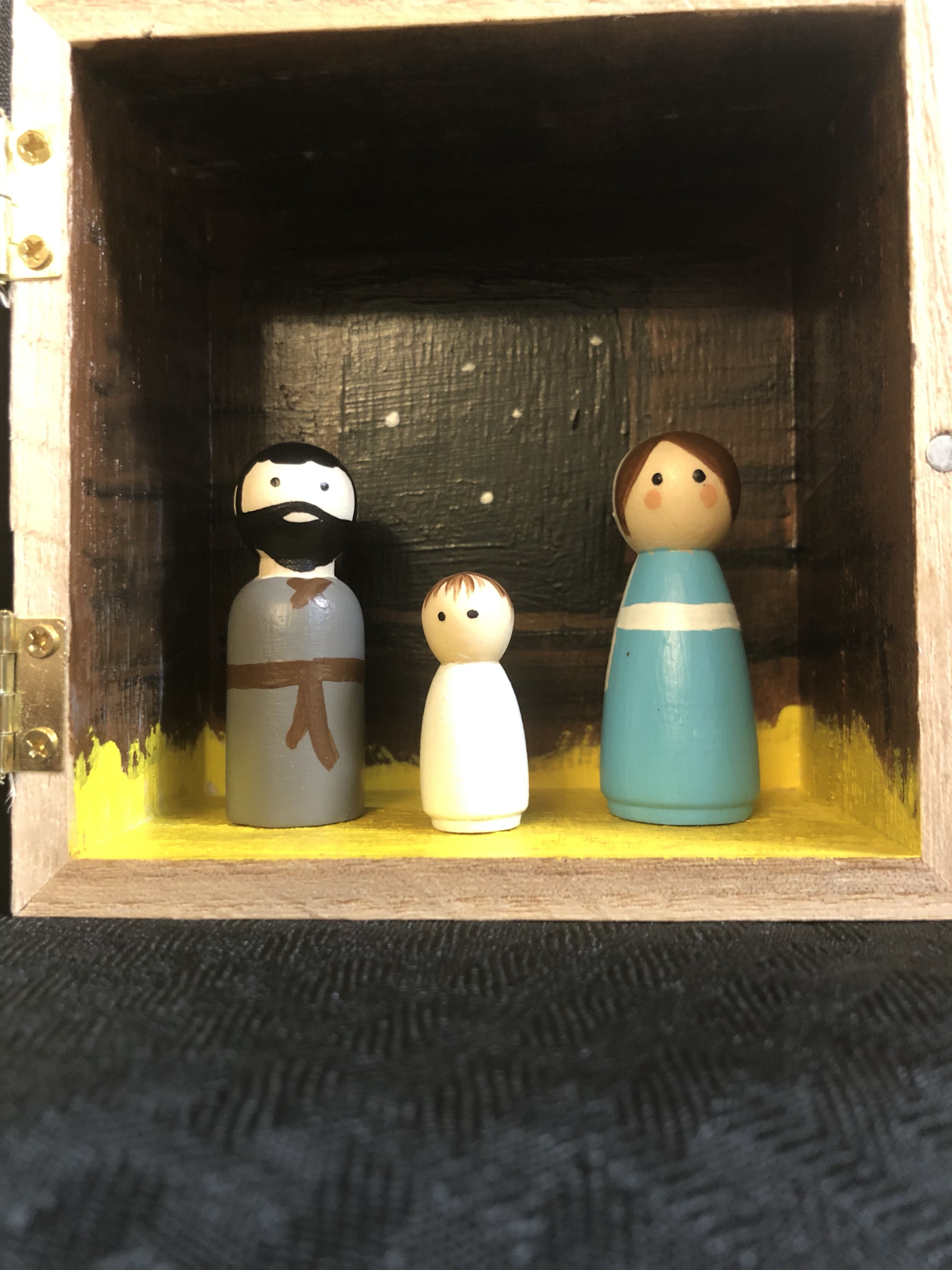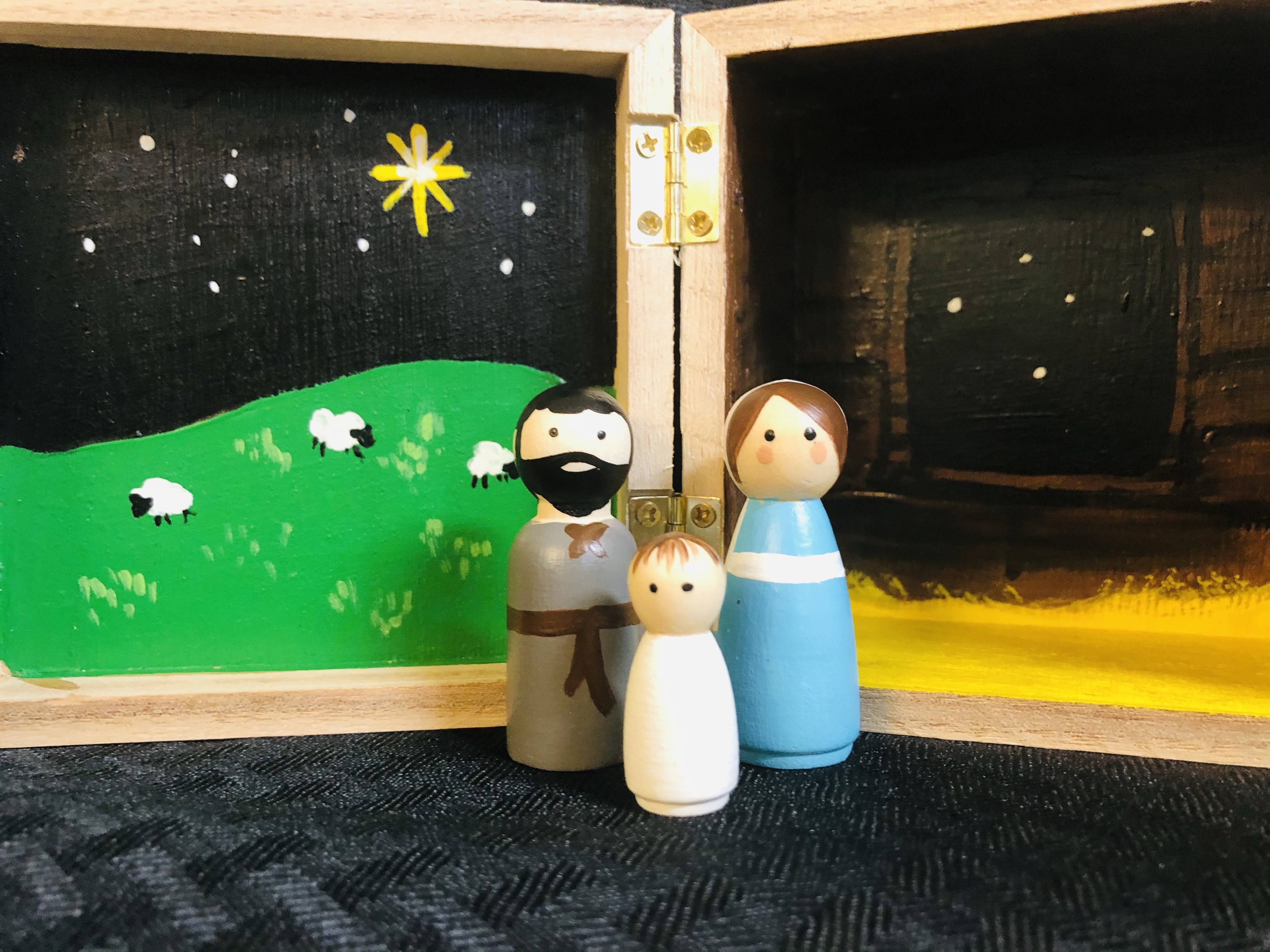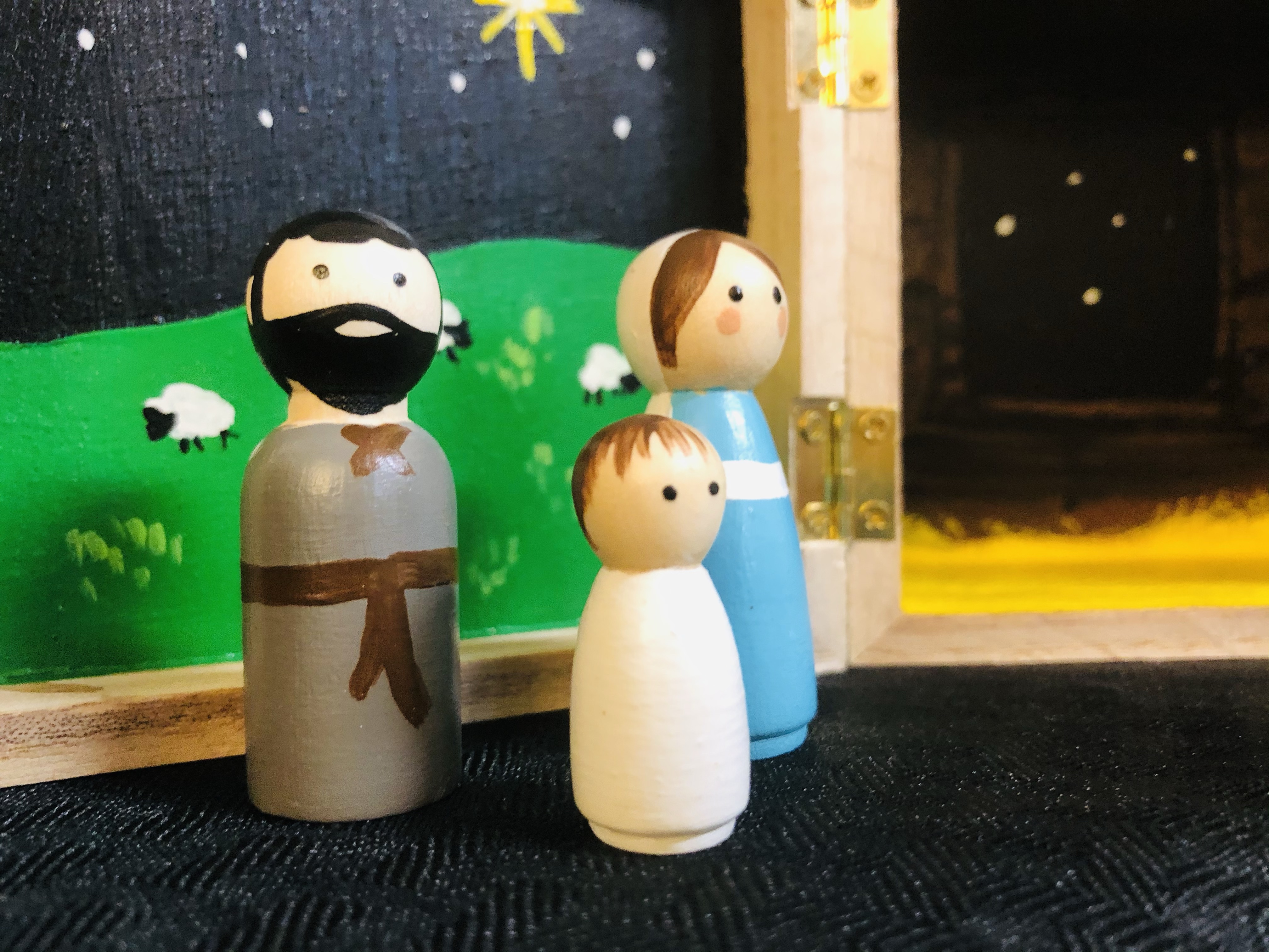 This Large Nativity Peg Collection comes with the Holy Family, two Shepherds and an angel, plus a large Scenic storage box which can also be used as a background for play and display!